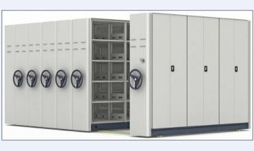 密集柜可單列或多列一起在導(dǎo)軌上行走,每列具有手剎制動(dòng)裝置--自鎖柄。自鎖柄在OFF位置時(shí),架體不能移動(dòng),在ON位置時(shí),架體可移動(dòng),每列架體的側(cè)面板上有標(biāo)簽框,移動(dòng)列底務(wù)上有防倒裝置,每個(gè)組合箱體的前后各一列裝有總鎖,用于整體的鎖閉,起到保密作用,導(dǎo)軌的端部安裝限位裝置。
